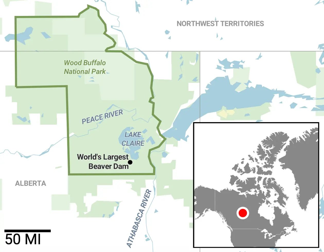 Cette merveille de la nature, qui a nécessité le travail de plusieurs générations de familles de castors, est située dans l'Alberta au Canada, au coeur du parc national Wood Buffalo, le plus grand parc national du pays.