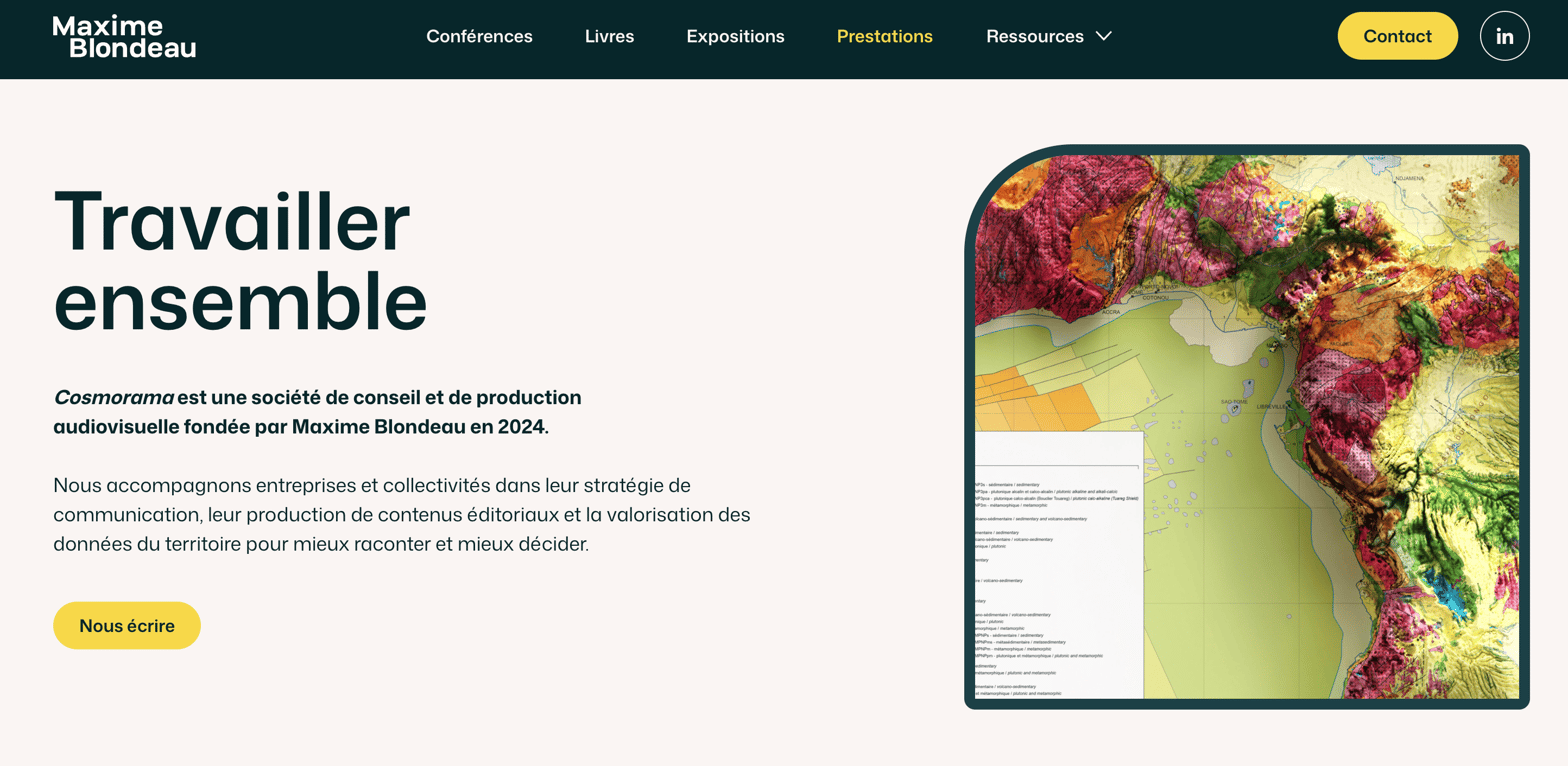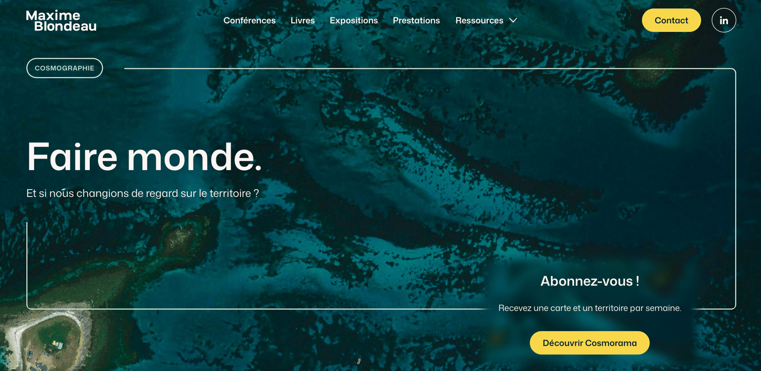 Chaque semaine dans Cosmorama, une carte, une image, une découverte pour penser le monde autrement et en prendre soin. Aujourd'hui, je vous invite à explorer mon nouveau site, mis en ligne cette semaine. Vous y trouverez mon histoire, mes conférences, mes livres, mes expo et mes offres de services. Jetez-y un coup d'oeil 👇