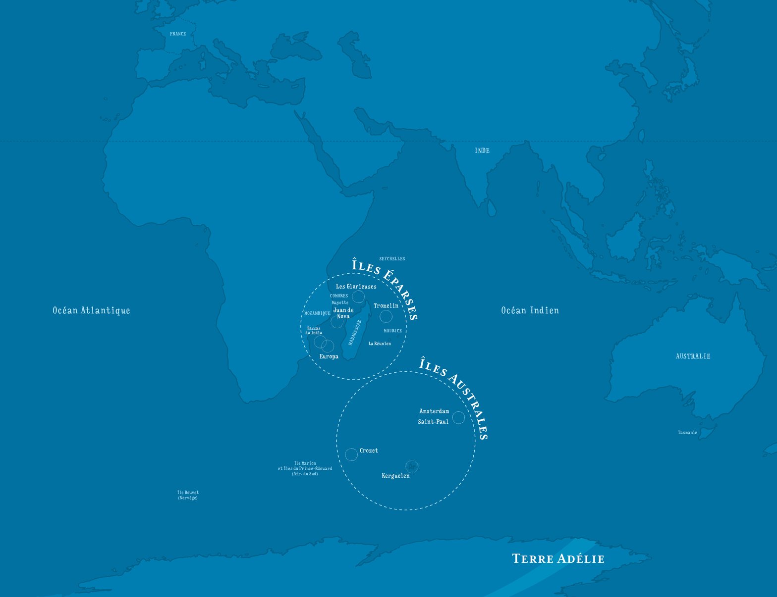 Ce sont les îles Crozet, Kerguelen, Amsterdam, Saint-Paul, et leurs cousines tropicales les îles Éparses – Europa, Juan de Nova, Bassas da India, les Glorieuses, Tromelin, auxquelles il faut ajouter l'immense Terre Adélie, portion française de l'Antarctique.