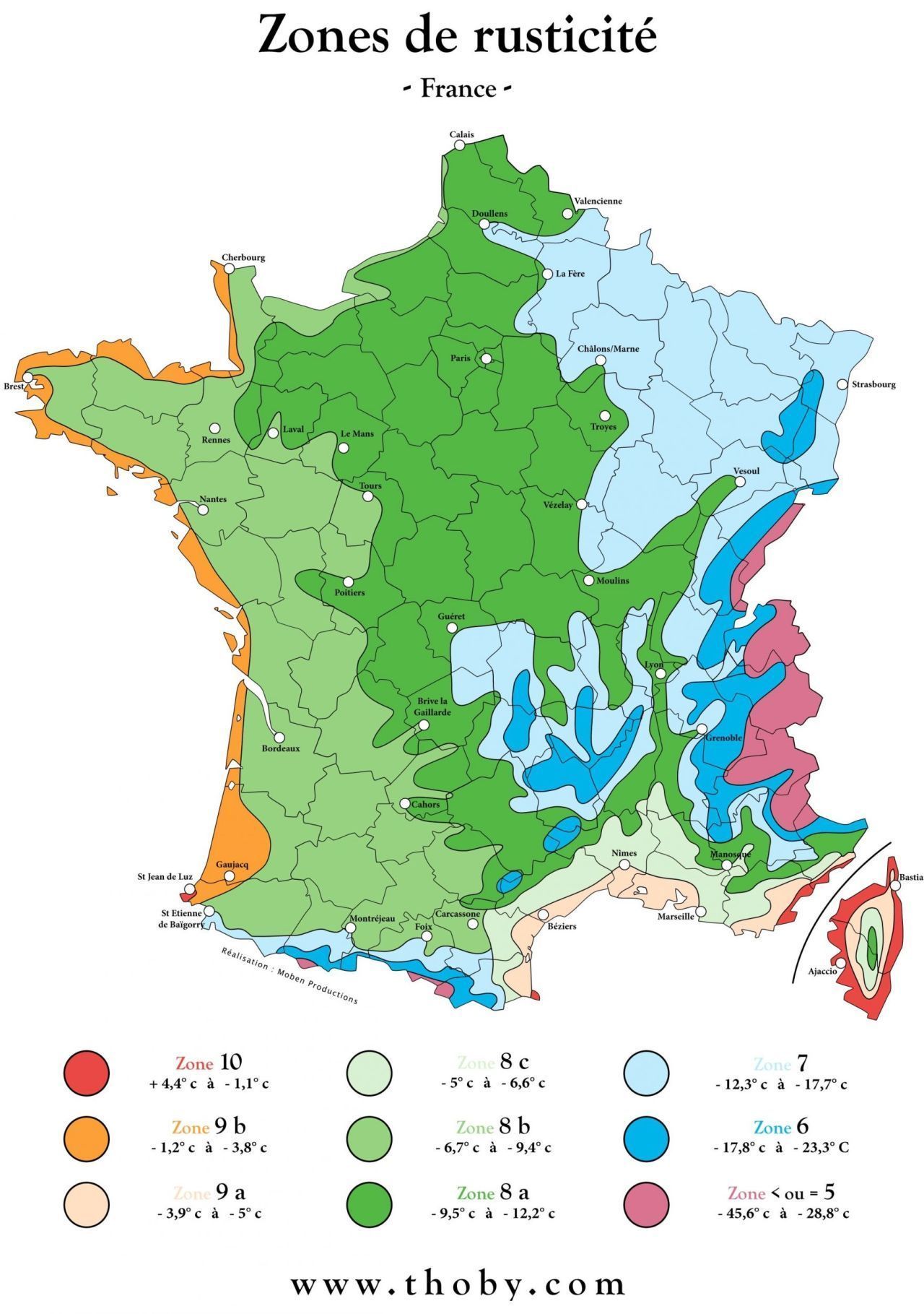 La France se situe entre le niveau 5 pour les Alpes et le Jura, et le niveau 10 pour la Corse et la côte d’Azur. On voit bien que la Bretagne, le cotentin et le littoral méditerranéen sont beaucoup plus doux en hiver que la majorité du territoire français.
